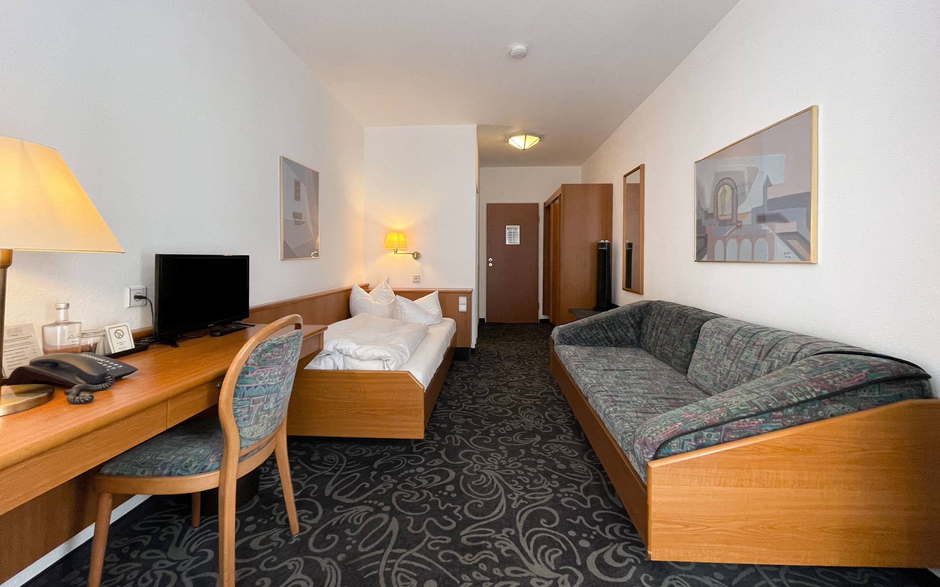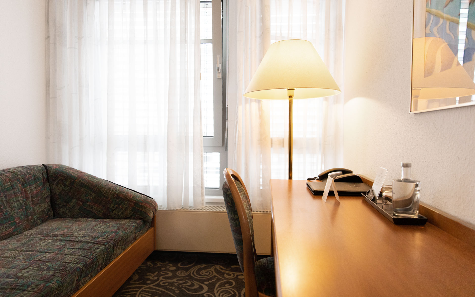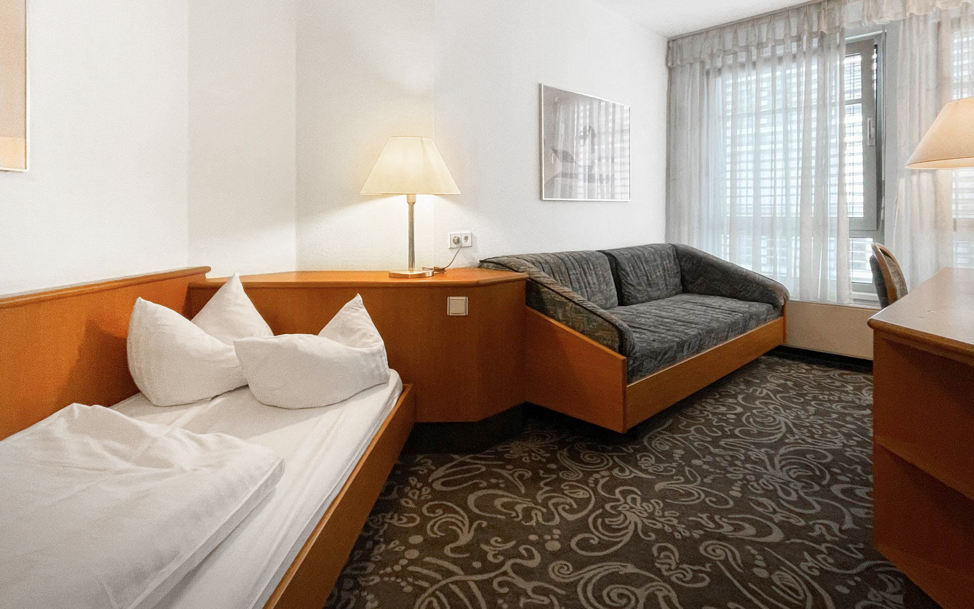 Das Zimmer mit dem gewissen Extra: Unser Einzelzimmer Plus. Neben einem komfortablen Einzelbett steht Ihnen in diesem Zimmer zusätzlich eine bequeme Couch zur Verfügung. Für ein wohnliches Ambiente sorgt die individuelle Gestaltung und der großzügige Grundriss des Zimmers. Kostenloses WLAN und ein Arbeitsplatz sind ebenfalls inbegriffen. Zur Ausstattung des privaten Badezimmers gehört eine Dusche und ein WC, sowie ein Fön und ein Kosmetikspiegel, Handtücher, Toilettenpapier, Duschgel und Seife. Das täglich frisch von uns zubereitete Frühstücksbuffet können Sie jeden Morgen im Frühstücksraum des 2. Stocks genießen. Unser Ziel ist es, dass Sie sich bei uns wohlfühlen und Ihren Aufenthalt genießen. Wenn wir noch etwas für Sie tun können, lassen Sie es uns wissen.